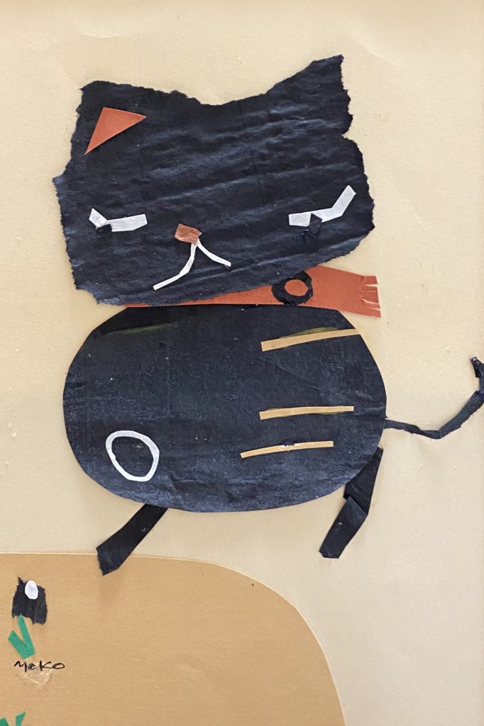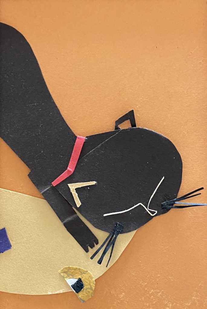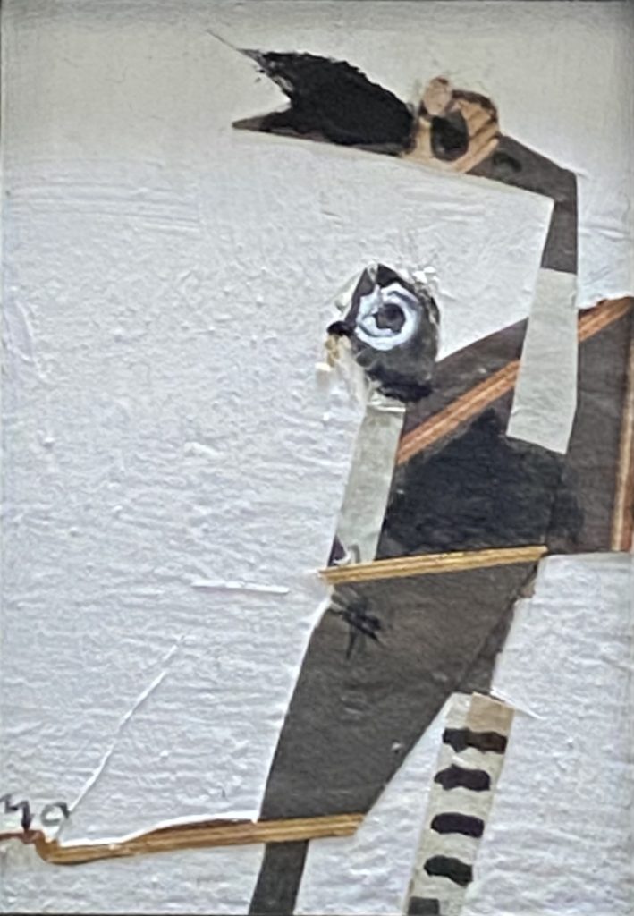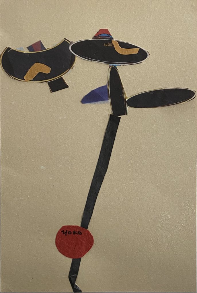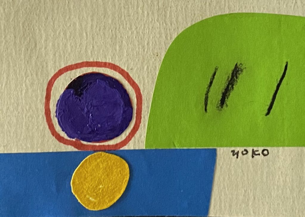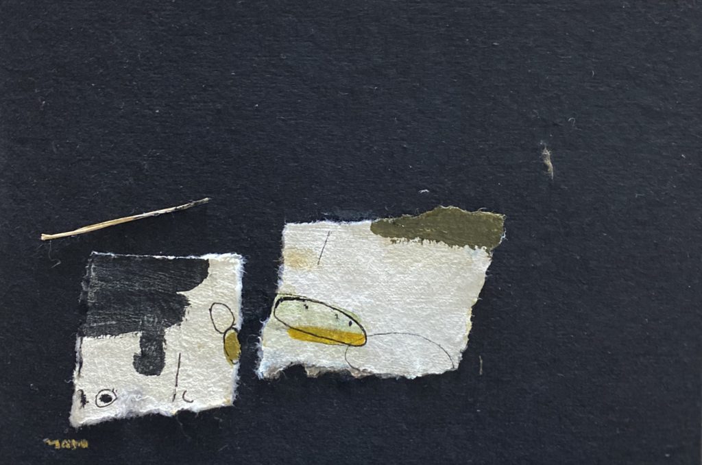 彼女の切り絵には、(彼女の全作品に言えることですが)作風を超えて世界観が通底しています。それは、時代と共に変化していく表現(暗い色調のシリアスなタッチから動物を思わす生き物をモチーフにしたもの、より抽象的な不定形なカタチと色が危ういバランスをとったものなど)にも揺るがない独自の軸が見えるのです。                                    その事が一番解りやすいのが、この「切り絵」かもしれません。素材・手数・マチュエルを最小限に削ぎ落とした素の顔が覗きます。例えば初期の油彩「岩のある風景」にみられるテクスチュアを追求したような作風とは正反対に線と面で潔いほどに構成されています。そこに作家の強い覚悟を感じるのです。